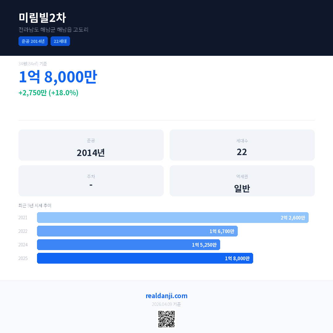 미림빌2차 국민평형 기준 2025년 평균 거래가는 1억 8,000만으로, 전년 대비 18.0% 상승 했습니다.