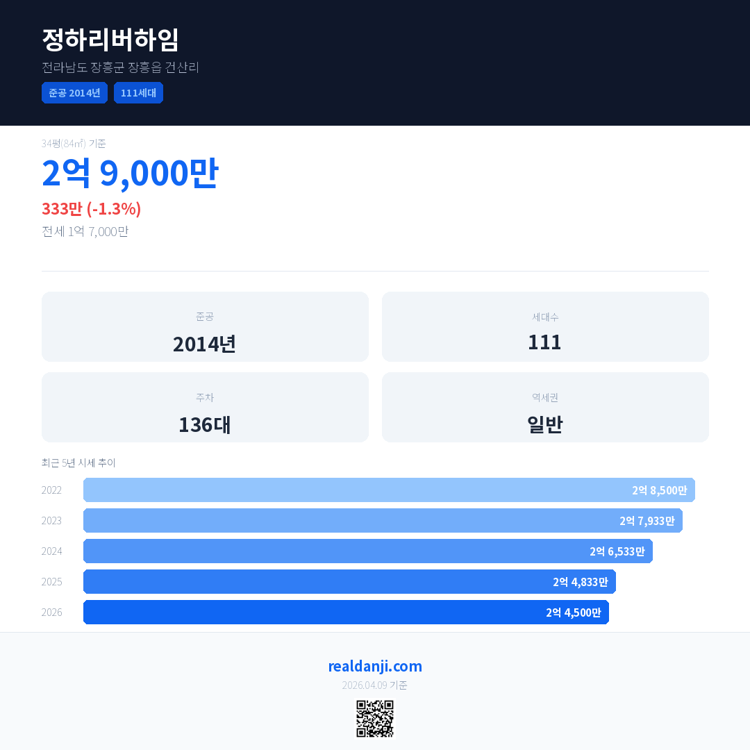 정하리버하임은(는) 2014년에 준공되었으며, 현재 12년차입니다. 총 111세대 규모입니다.