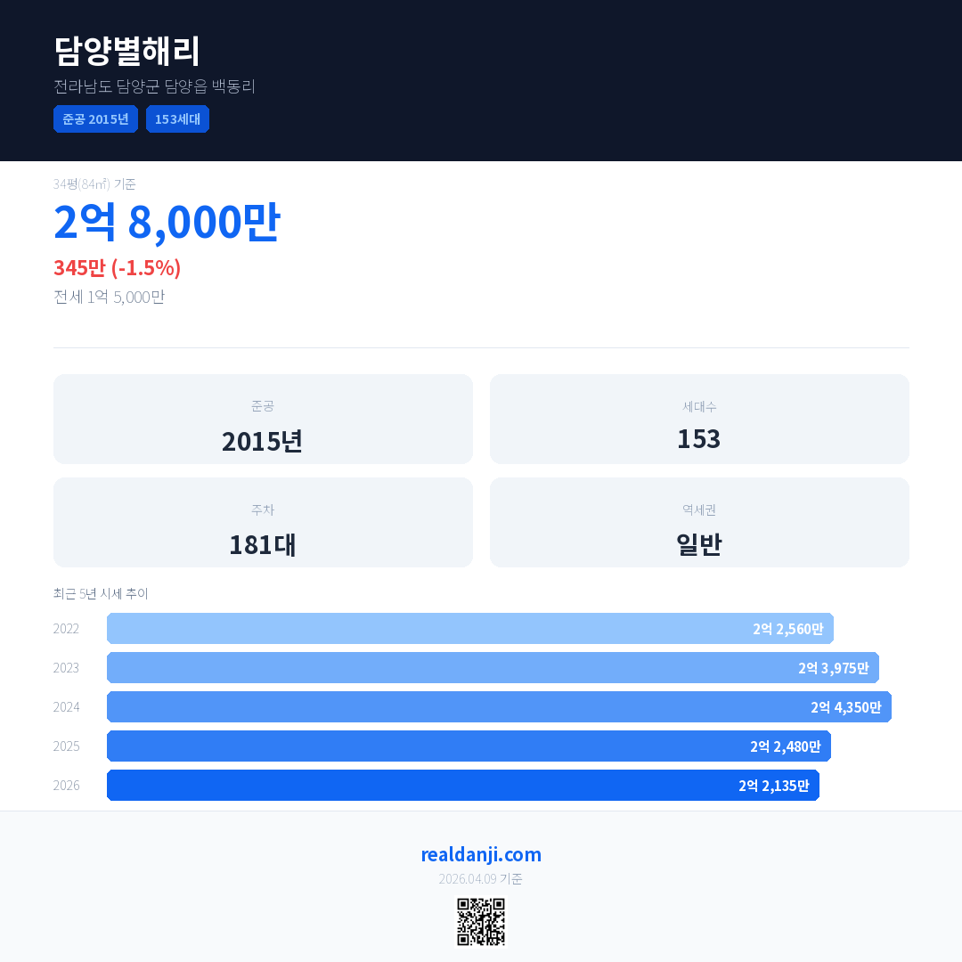 담양별해리 국민평형 기준 2026년 평균 거래가는 2억 2,135만으로, 전년 대비 1.5% 하락 했습니다.