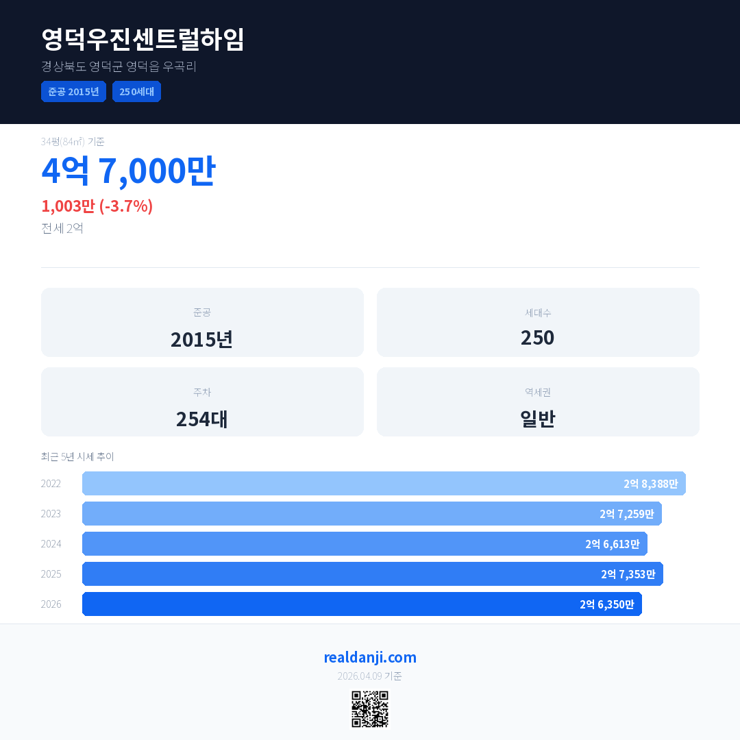 영덕우진센트럴하임 국민평형 기준 2026년 평균 거래가는 2억 6,350만으로, 전년 대비 3.7% 하락 했습니다.