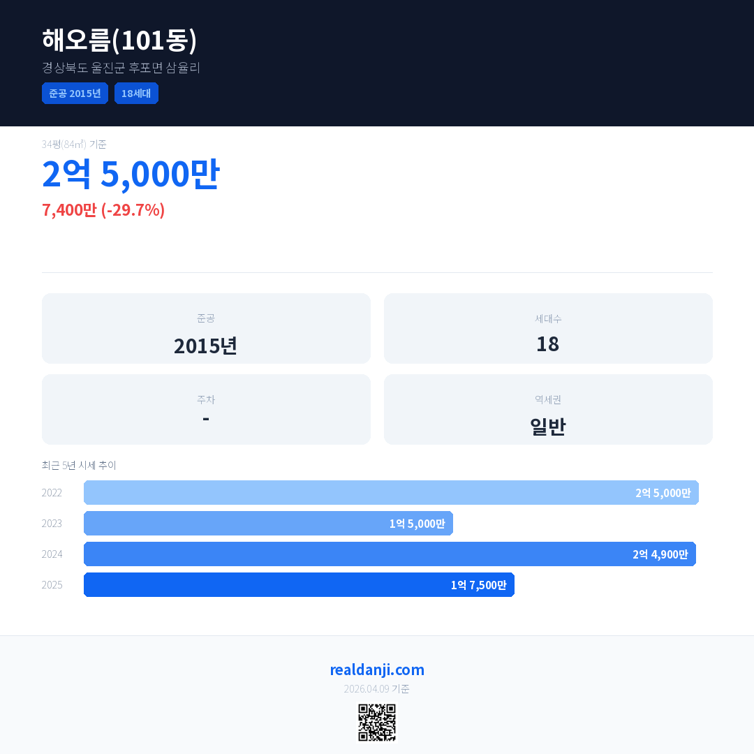 해오름(101동) 최근 거래가는 2억 5,000만입니다. (2025-05)