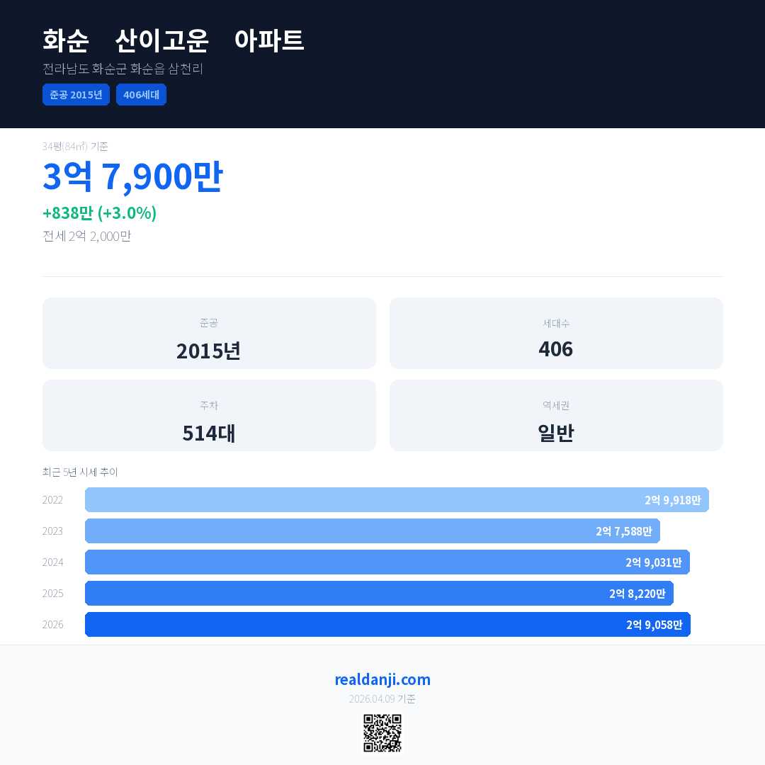 화순 산이고운 아파트 국민평형 기준 2026년 평균 거래가는 2억 9,058만으로, 전년 대비 3.0% 상승 했습니다.