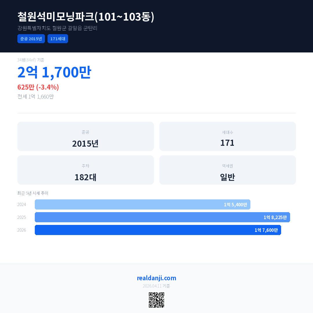 철원석미모닝파크(101~103동) 최근 거래가는 2억 1,700만입니다. (2026-01)