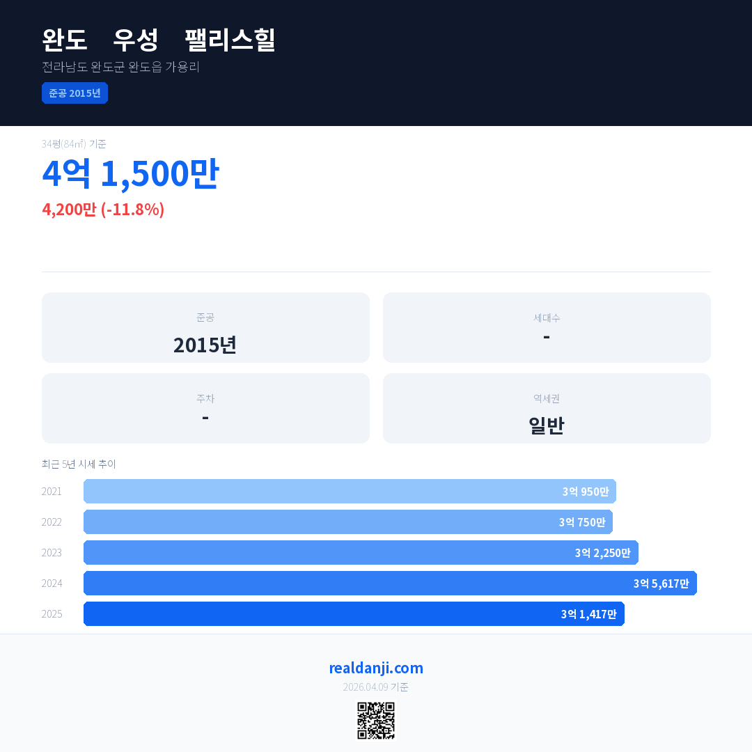 완도 우성 팰리스힐 국민평형 기준 2025년 평균 거래가는 3억 1,417만으로, 전년 대비 11.8% 하락 했습니다.