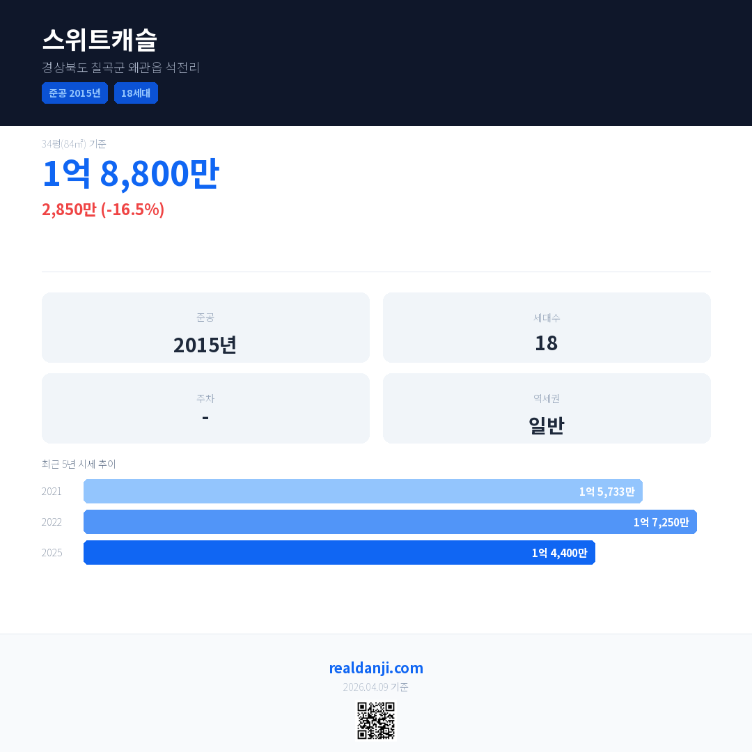 스위트캐슬 국민평형 기준 2025년 평균 거래가는 1억 4,400만으로, 전년 대비 16.5% 하락 했습니다.