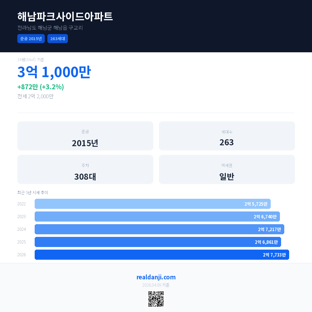해남파크사이드아파트 국민평형 기준 2026년 평균 거래가는 2억 7,733만으로, 전년 대비 3.2% 상승 했습니다.