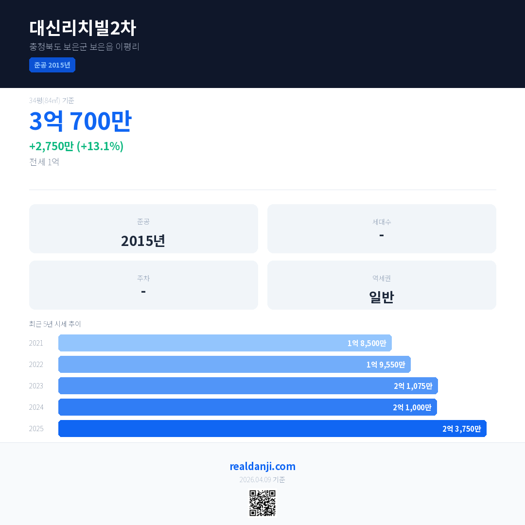 대신리치빌2차은(는) 2015년에 준공되었으며, 현재 11년차입니다.