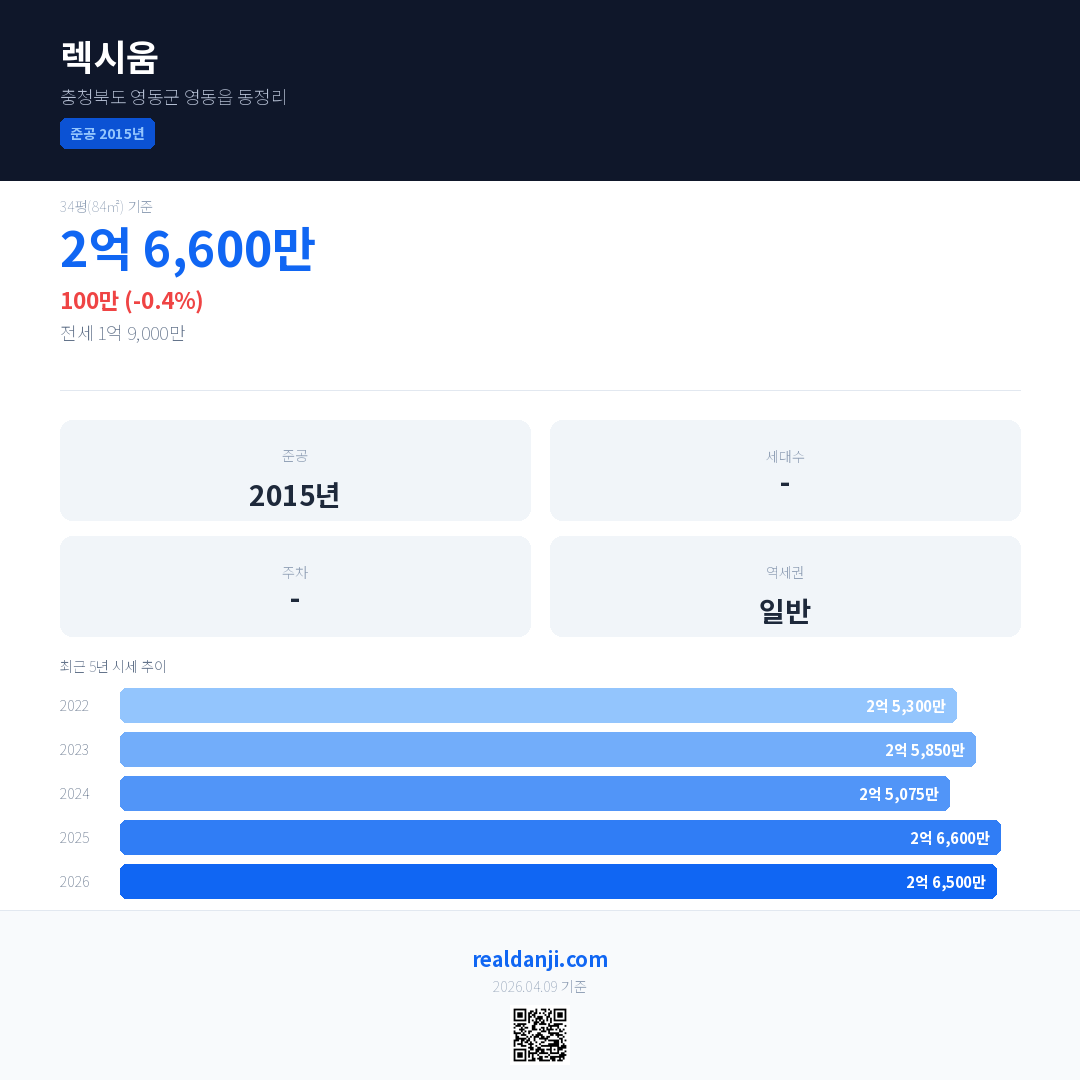 렉시움 국민평형 기준 2026년 평균 거래가는 2억 6,500만으로, 전년 대비 0.4% 하락 했습니다.