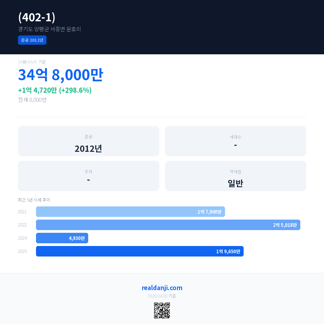 (402-1) 국민평형 기준 2025년 평균 거래가는 1억 9,650만으로, 전년 대비 298.6% 상승 했습니다.