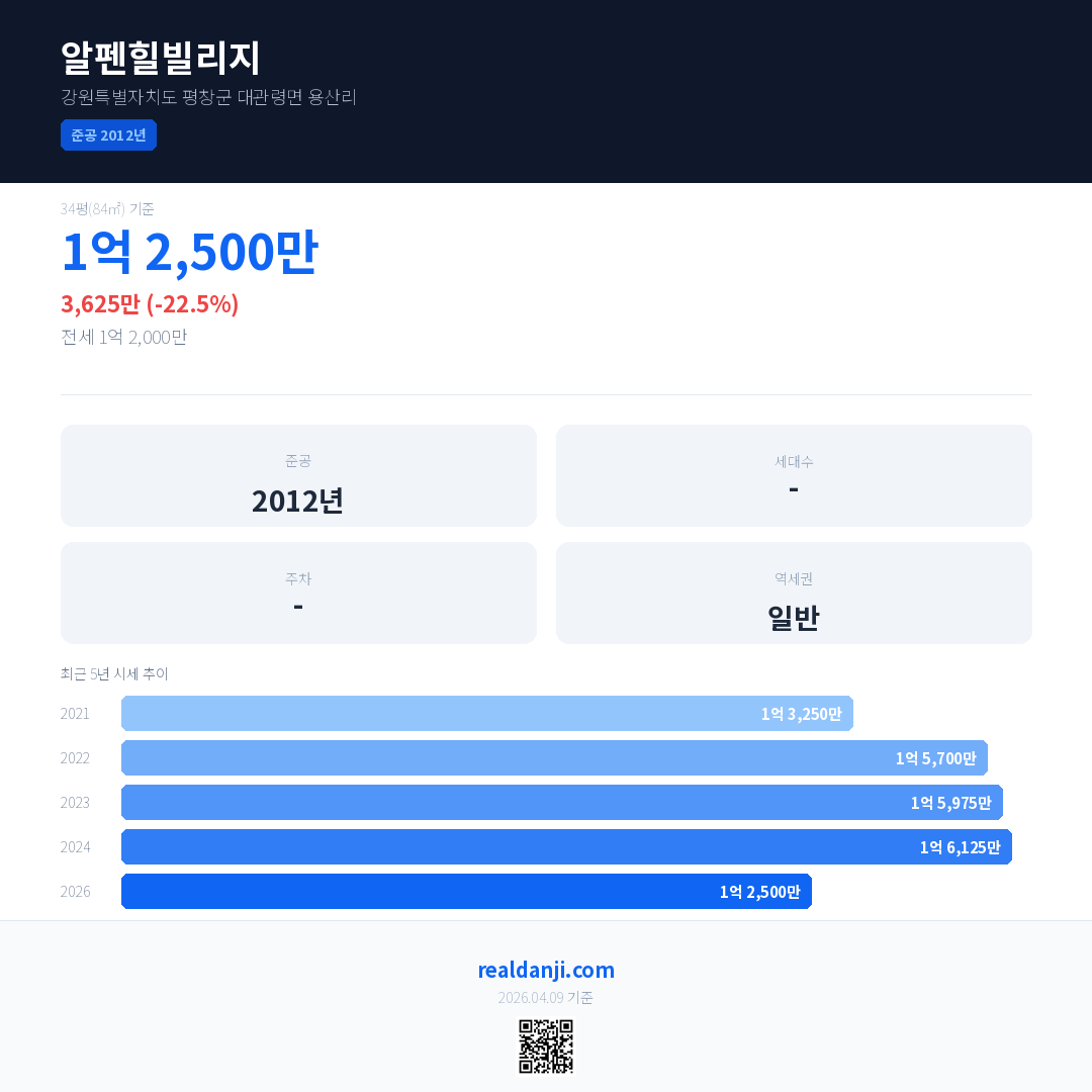 알펜힐빌리지 국민평형 기준 2026년 평균 거래가는 1억 2,500만으로, 전년 대비 22.5% 하락 했습니다.