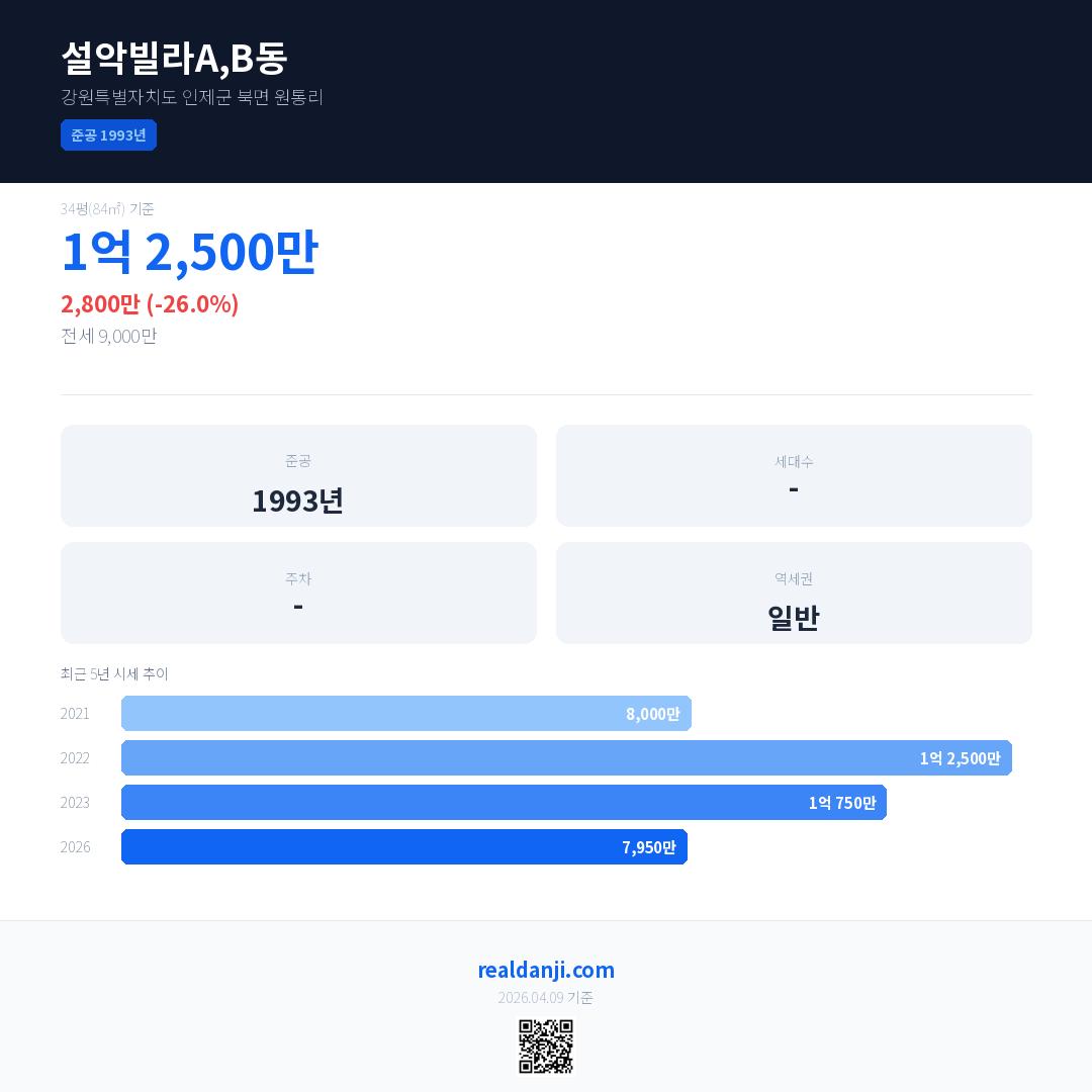 설악빌라A,B동 국민평형 기준 2026년 평균 거래가는 7,950만으로, 전년 대비 26.0% 하락 했습니다.