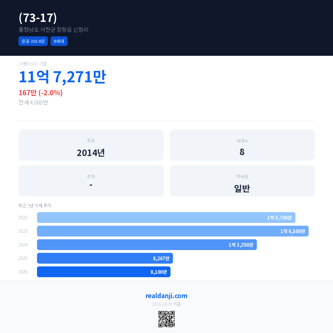 (73-17)은(는) 2014년에 준공되었으며, 현재 12년차입니다. 총 8세대 규모입니다.
