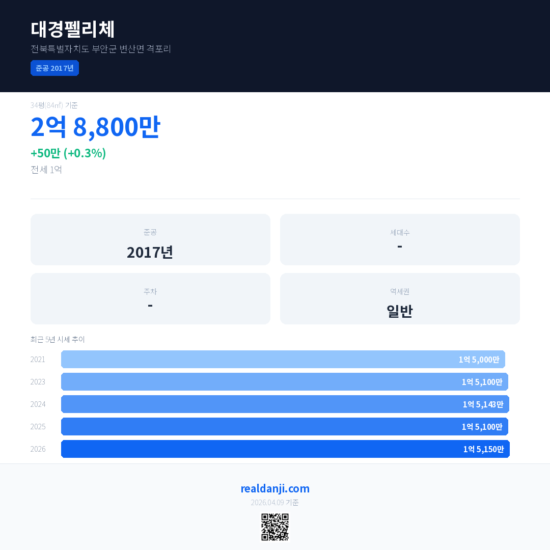 대경펠리체 국민평형 기준 2026년 평균 거래가는 1억 5,150만으로, 전년 대비 0.3% 상승 했습니다.