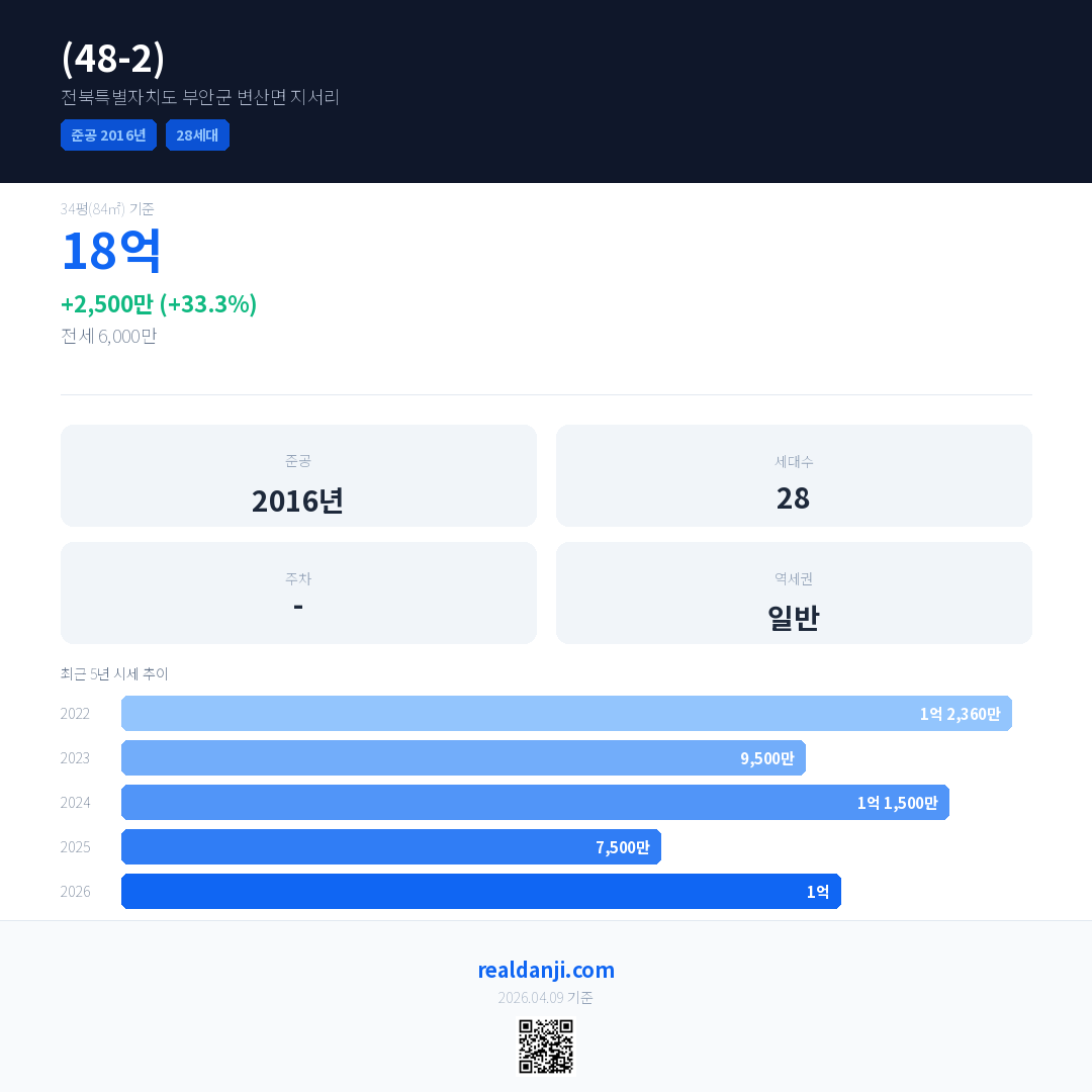 (48-2)은(는) 2016년에 준공되었으며, 현재 10년차입니다. 총 28세대 규모입니다.