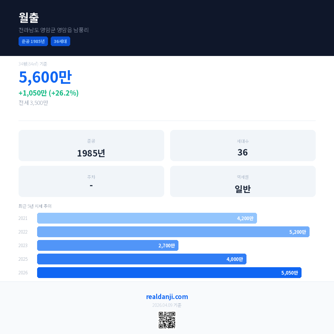 월출 국민평형 기준 2026년 평균 거래가는 5,050만으로, 전년 대비 26.2% 상승 했습니다.