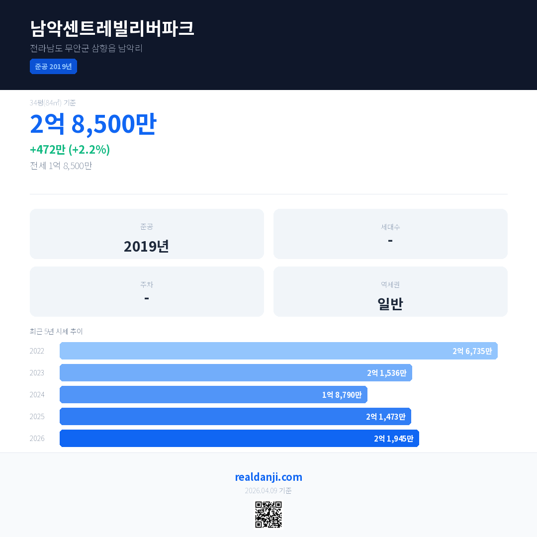 남악센트레빌리버파크 국민평형 기준 2026년 평균 거래가는 2억 1,945만으로, 전년 대비 2.2% 상승 했습니다.