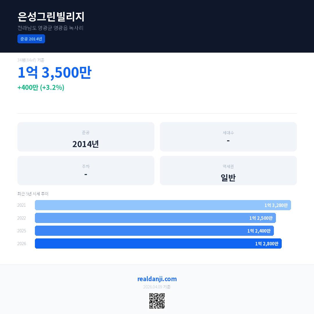 은성그린빌리지 국민평형 기준 2026년 평균 거래가는 1억 2,800만으로, 전년 대비 3.2% 상승 했습니다.