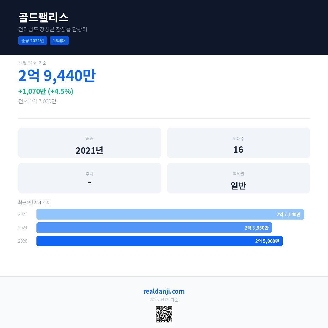 골드팰리스 국민평형 기준 2026년 평균 거래가는 2억 5,000만으로, 전년 대비 4.5% 상승 했습니다.