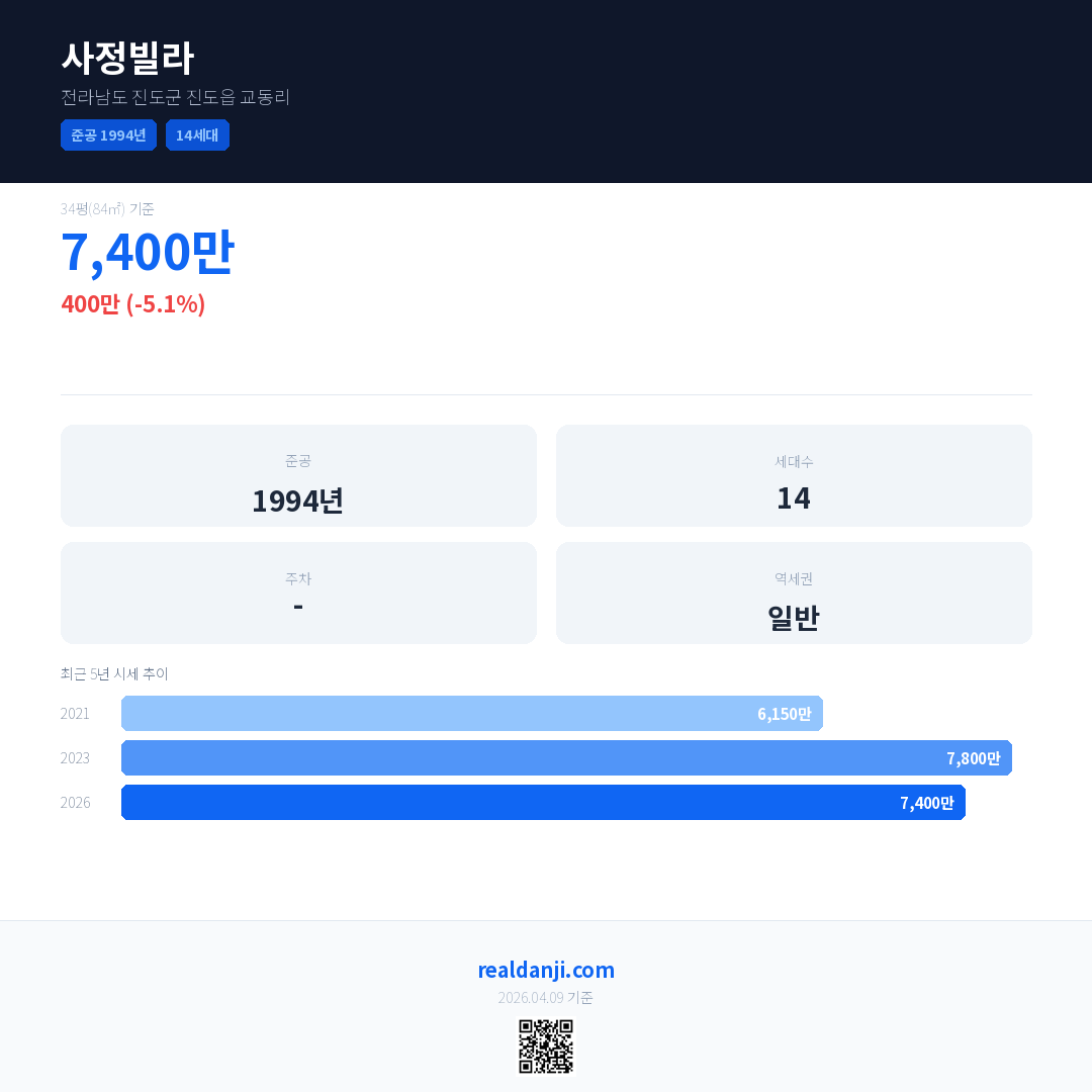 사정빌라 국민평형 기준 2026년 평균 거래가는 7,400만으로, 전년 대비 5.1% 하락 했습니다.