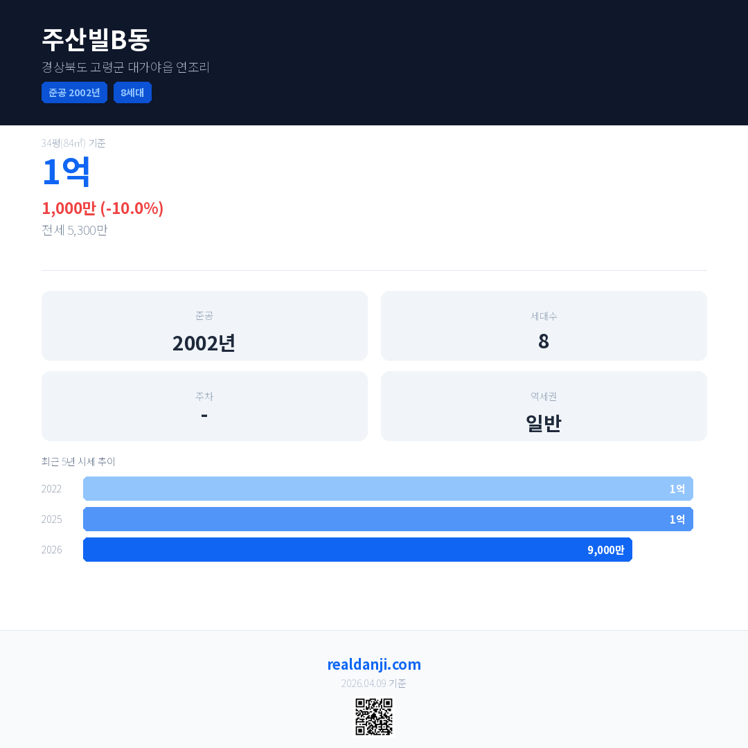 주산빌B동 최근 거래가는 1억입니다. (2026-02)
