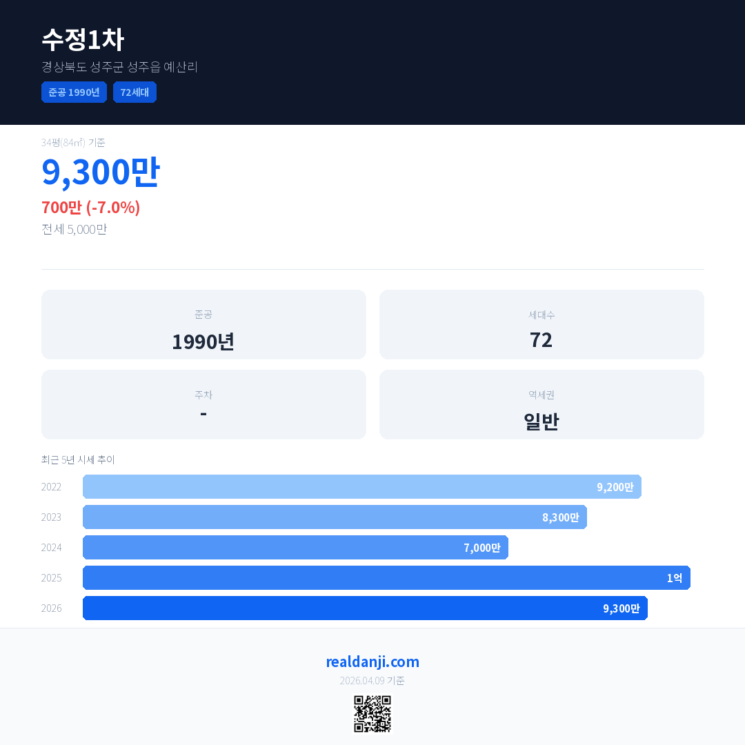 수정1차 국민평형 기준 2026년 평균 거래가는 9,300만으로, 전년 대비 7.0% 하락 했습니다.