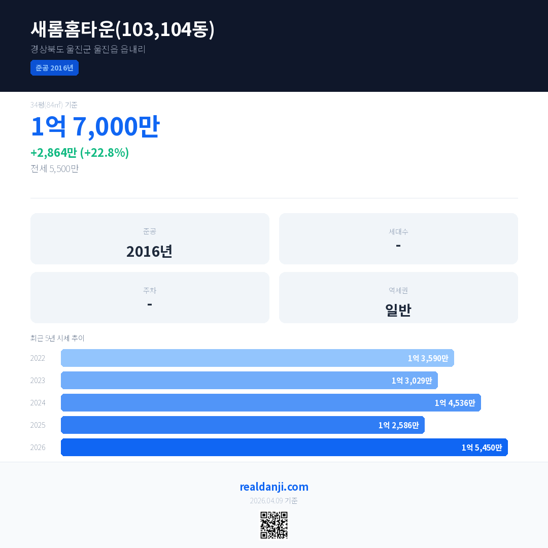 새롬홈타운(103,104동) 국민평형 기준 2026년 평균 거래가는 1억 5,450만으로, 전년 대비 22.8% 상승 했습니다.