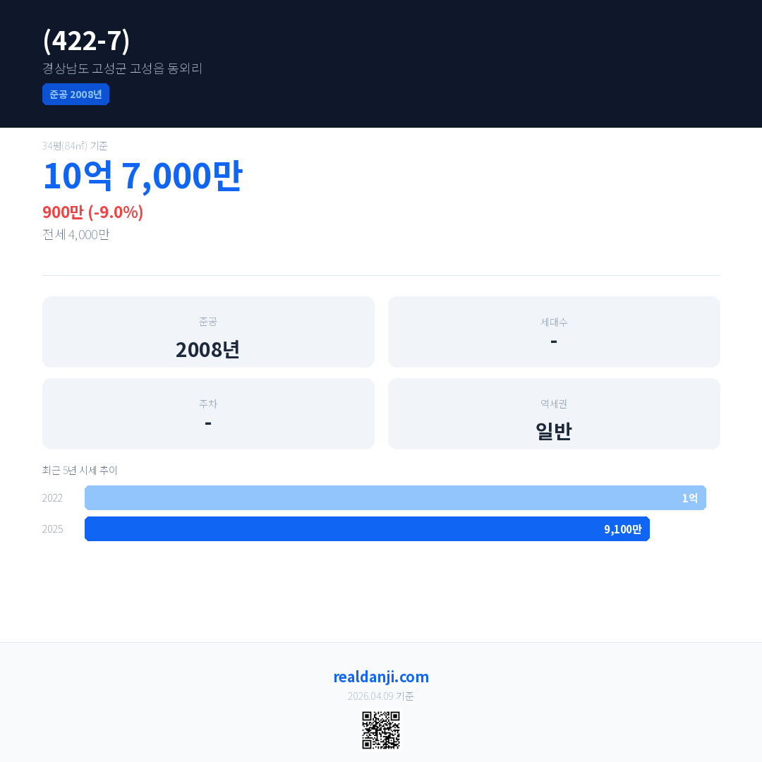 (422-7) 국민평형 기준 2025년 평균 거래가는 9,100만으로, 전년 대비 9.0% 하락 했습니다.