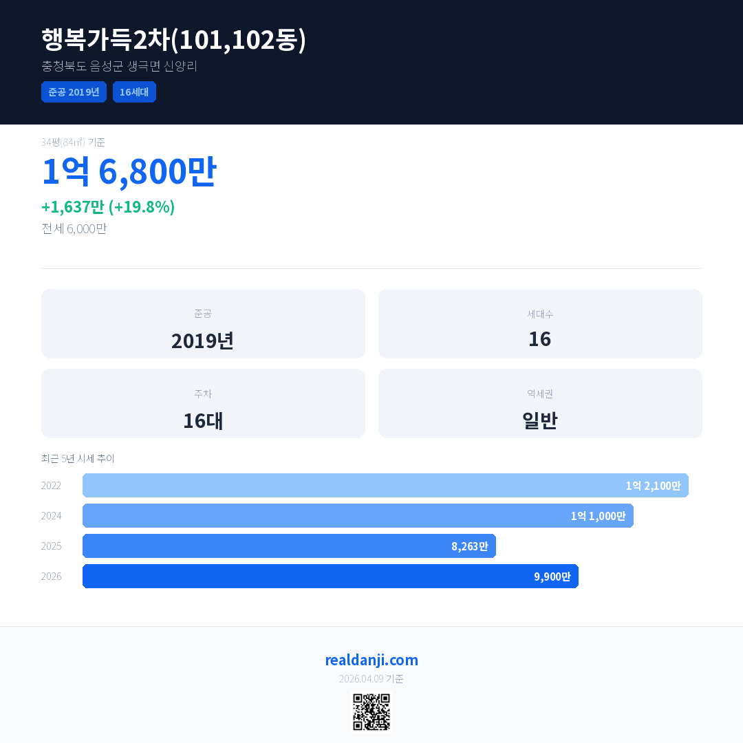 행복가득2차(101,102동) 최근 거래가는 1억 6,800만입니다. (2026-03)