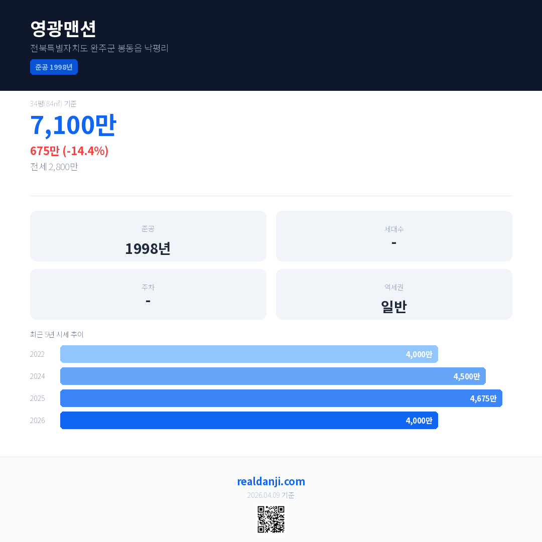 영광맨션 국민평형 기준 2026년 평균 거래가는 4,000만으로, 전년 대비 14.4% 하락 했습니다.