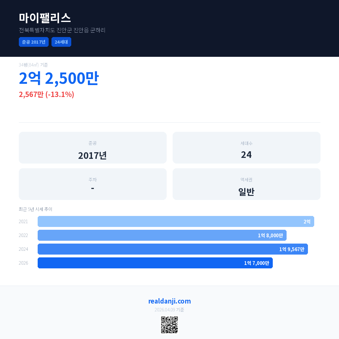 마이팰리스 국민평형 기준 2026년 평균 거래가는 1억 7,000만으로, 전년 대비 13.1% 하락 했습니다.