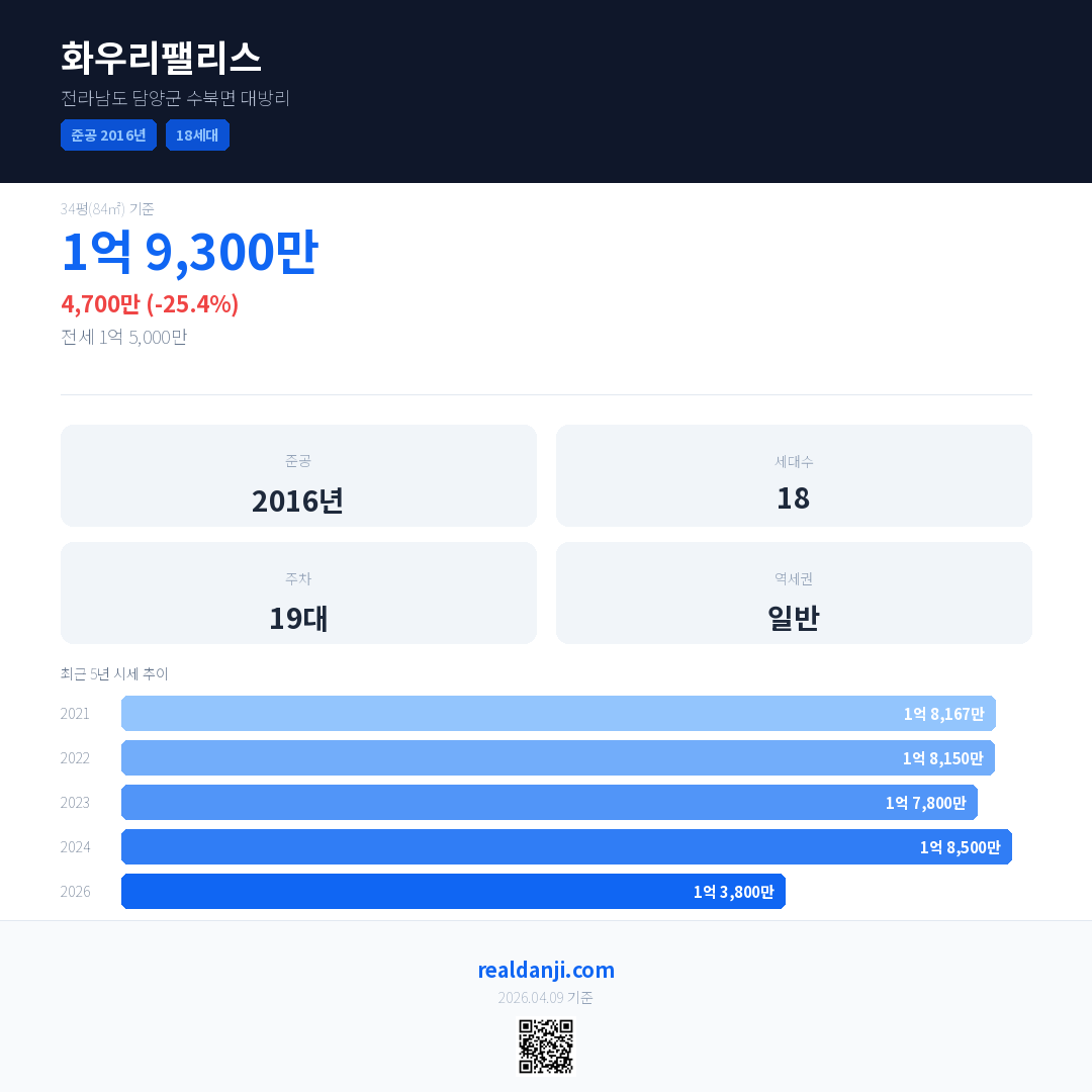 화우리팰리스 국민평형 기준 2026년 평균 거래가는 1억 3,800만으로, 전년 대비 25.4% 하락 했습니다.
