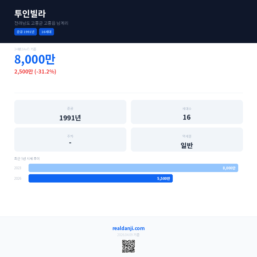 투인빌라 국민평형 기준 2026년 평균 거래가는 5,500만으로, 전년 대비 31.2% 하락 했습니다.