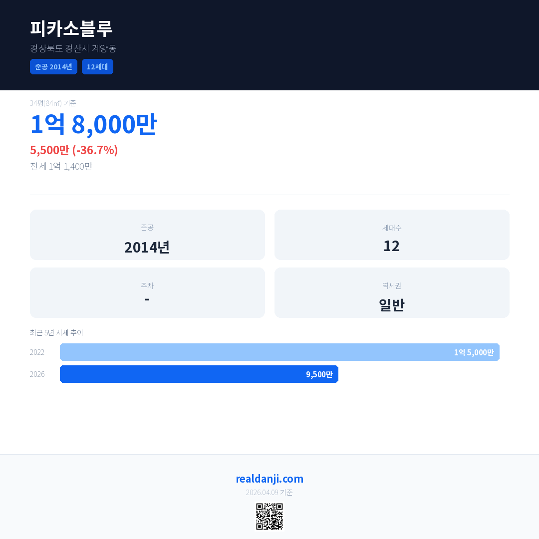 피카소블루 국민평형 기준 2026년 평균 거래가는 9,500만으로, 전년 대비 36.7% 하락 했습니다.