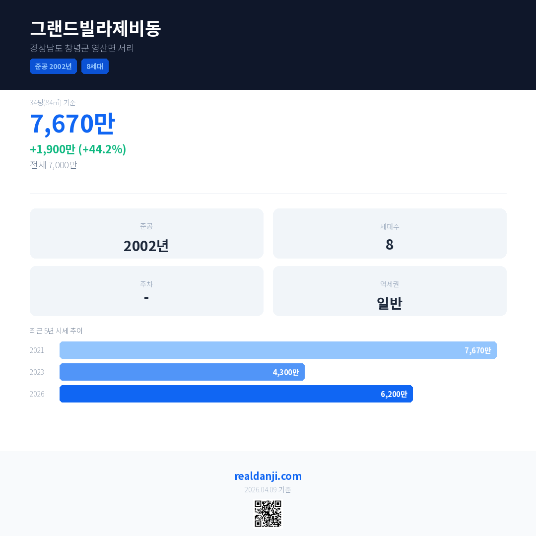 그랜드빌라제비동은(는) 2002년에 준공되었으며, 현재 24년차입니다. 총 8세대 규모입니다.