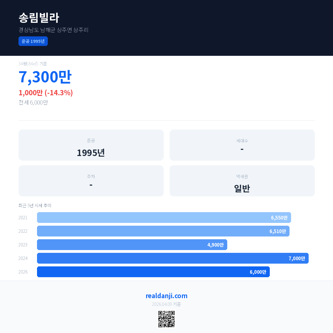 송림빌라 최근 거래가는 6,000만입니다. (2026-03)