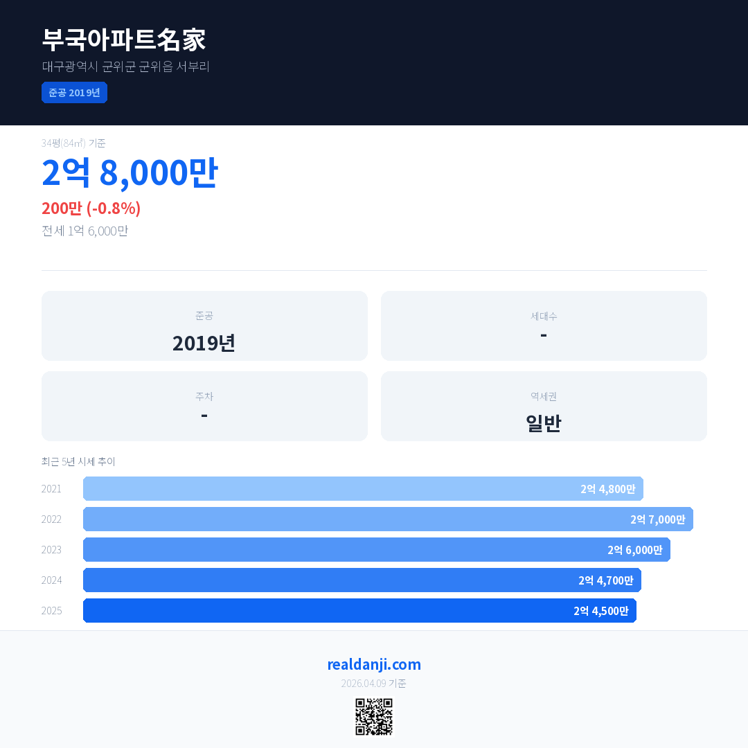 부국아파트名家 국민평형 기준 2025년 평균 거래가는 2억 4,500만으로, 전년 대비 0.8% 하락 했습니다.