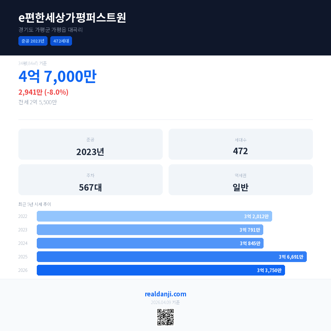 e편한세상가평퍼스트원은(는) 2023년에 준공되었으며, 현재 3년차입니다. 총 472세대 규모입니다.