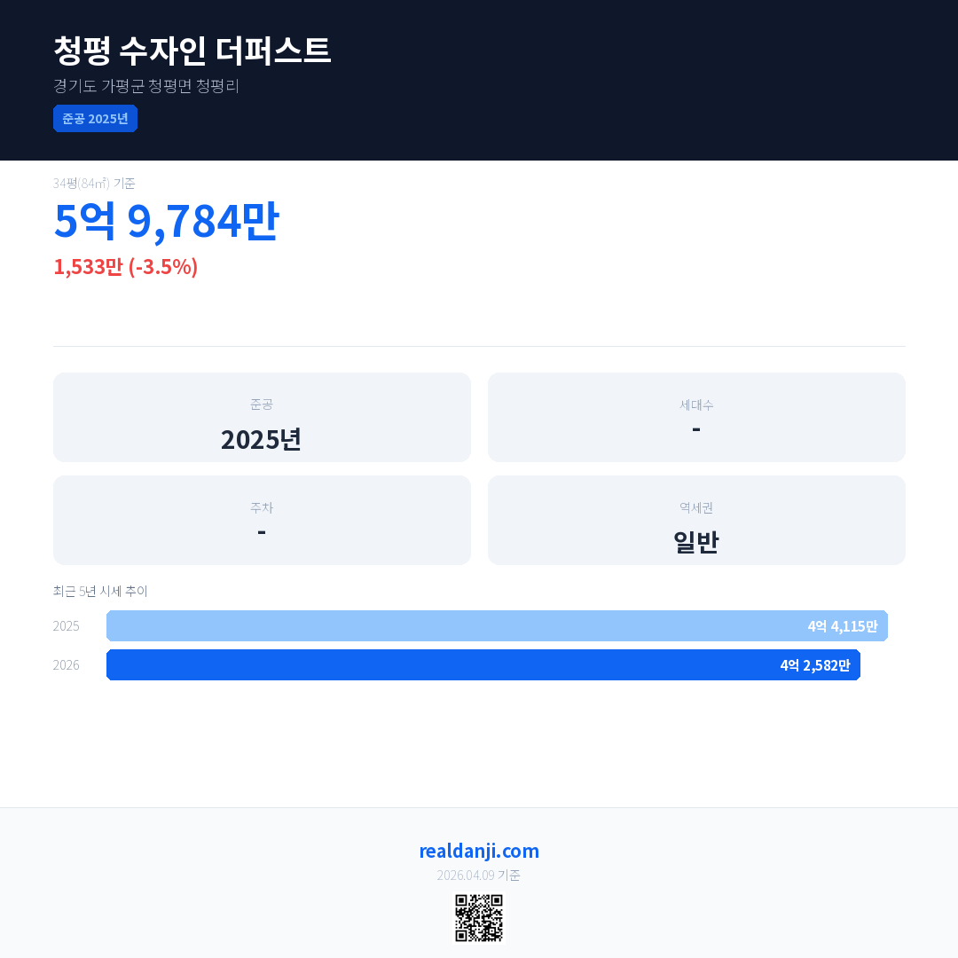 청평 수자인 더퍼스트 국민평형 기준 2026년 평균 거래가는 4억 2,582만으로, 전년 대비 3.5% 하락 했습니다.
