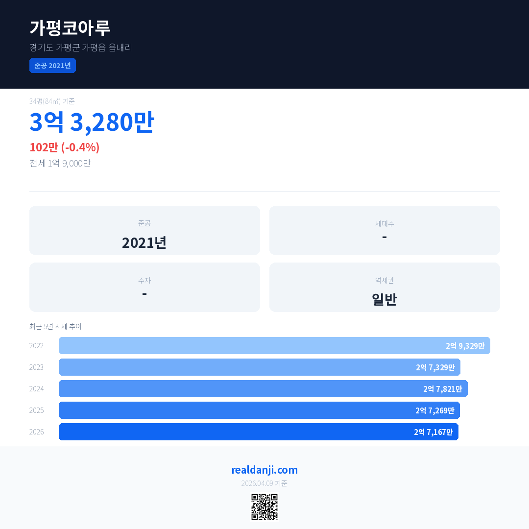 가평코아루 최근 거래가는 3억 3,280만입니다. (2026-03)