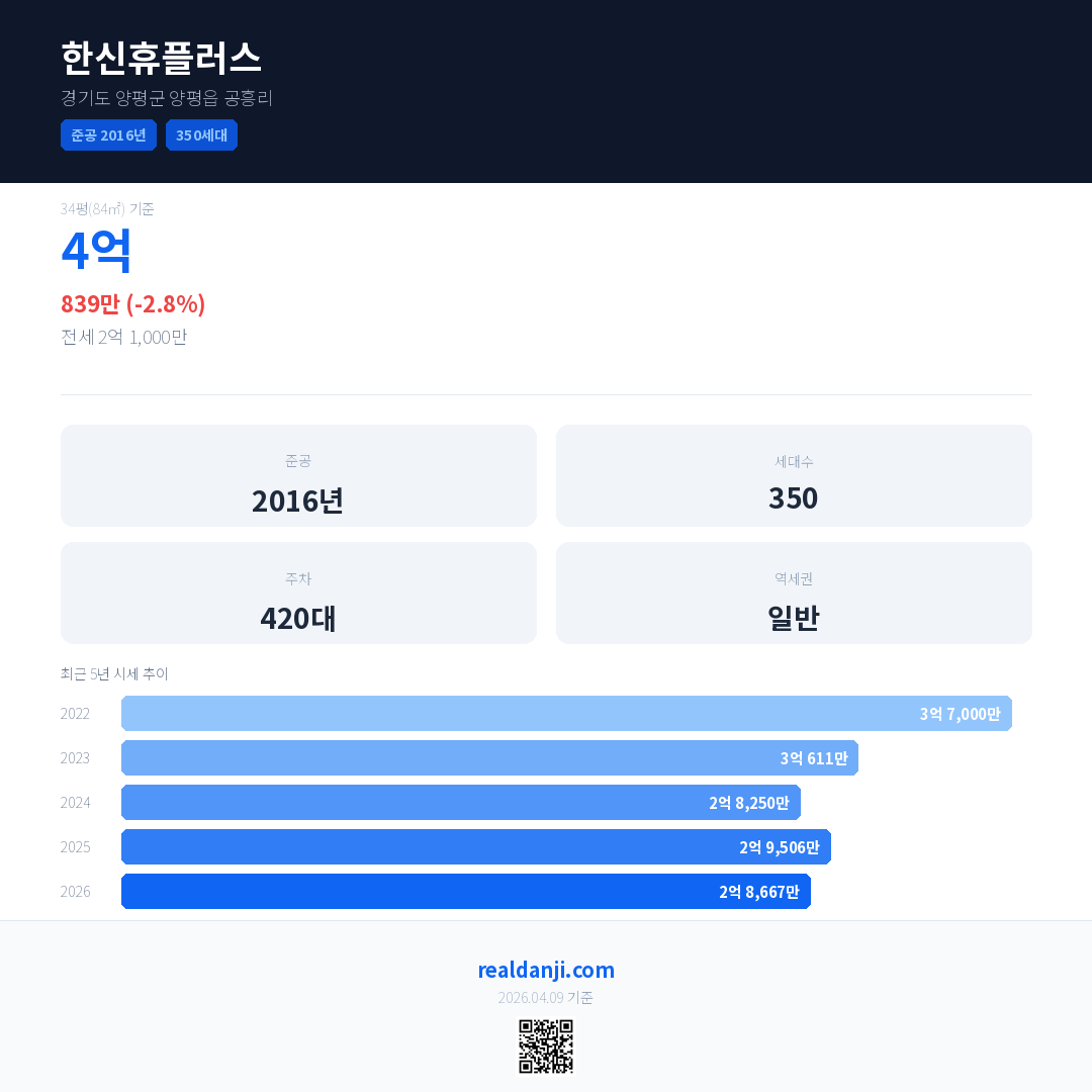 한신휴플러스은(는) 2016년에 준공되었으며, 현재 10년차입니다. 총 350세대 규모입니다.
