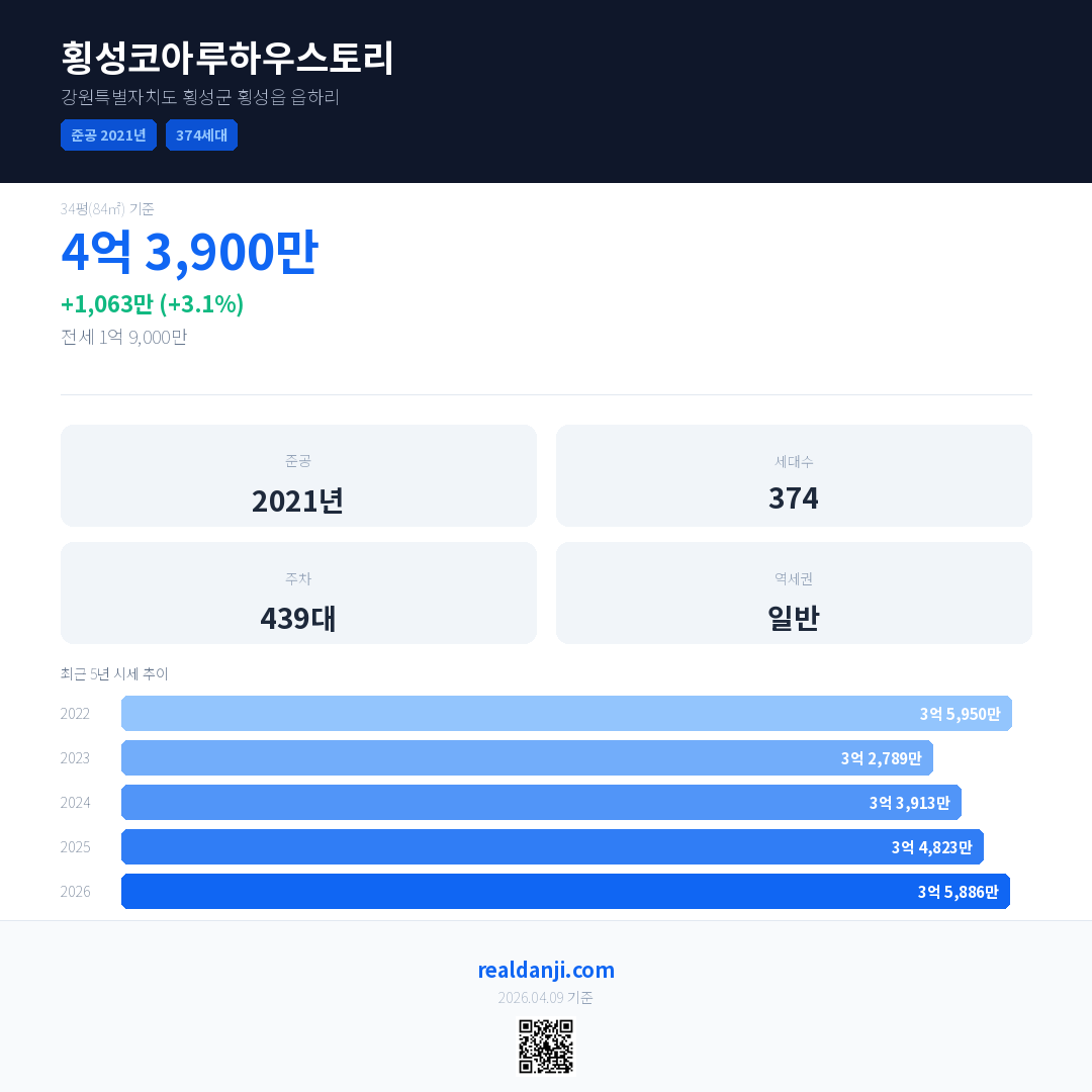 횡성코아루하우스토리 최근 거래가는 4억 3,900만입니다. (2026-03)
