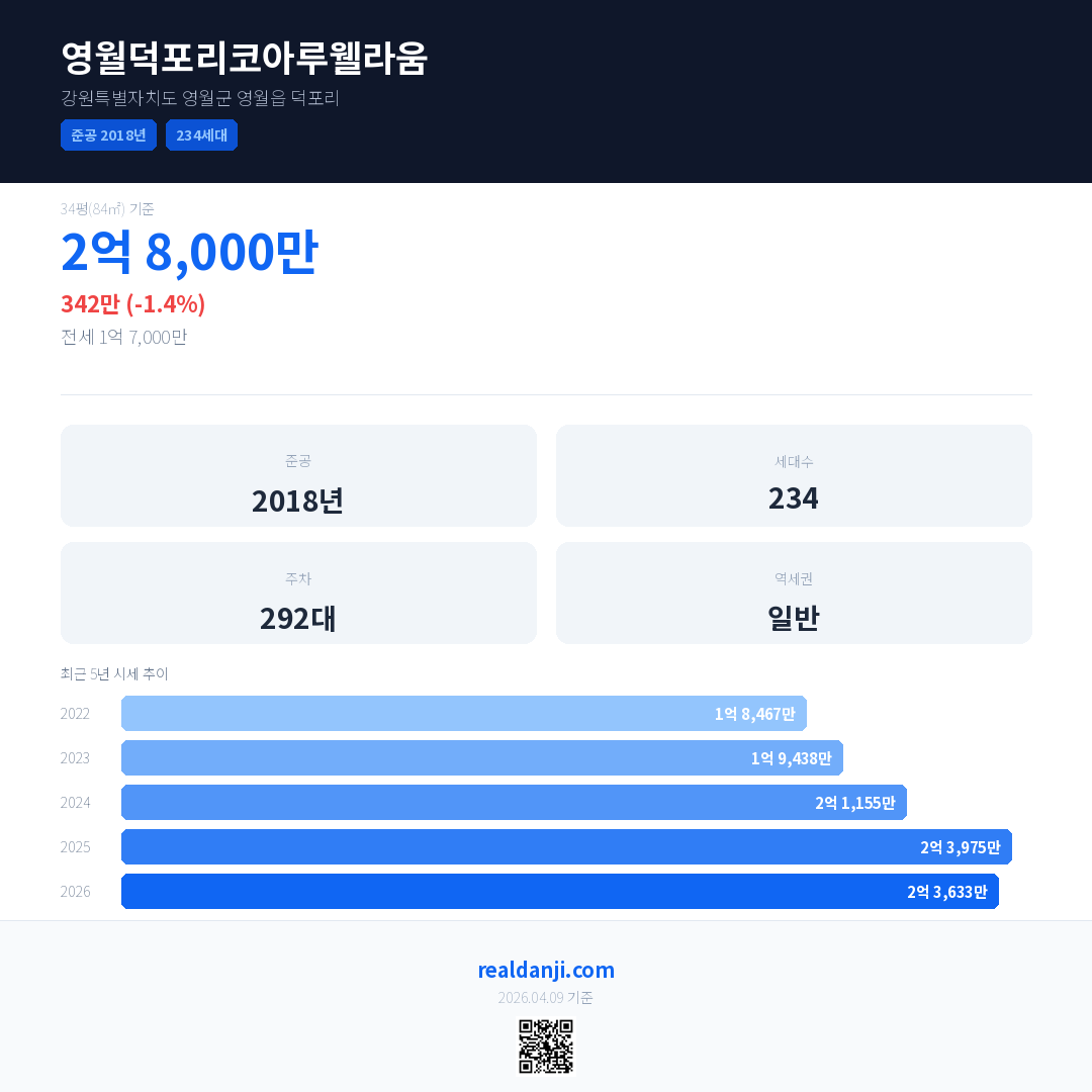 영월덕포리코아루웰라움 최근 거래가는 2억 3,300만입니다. (2026-02)