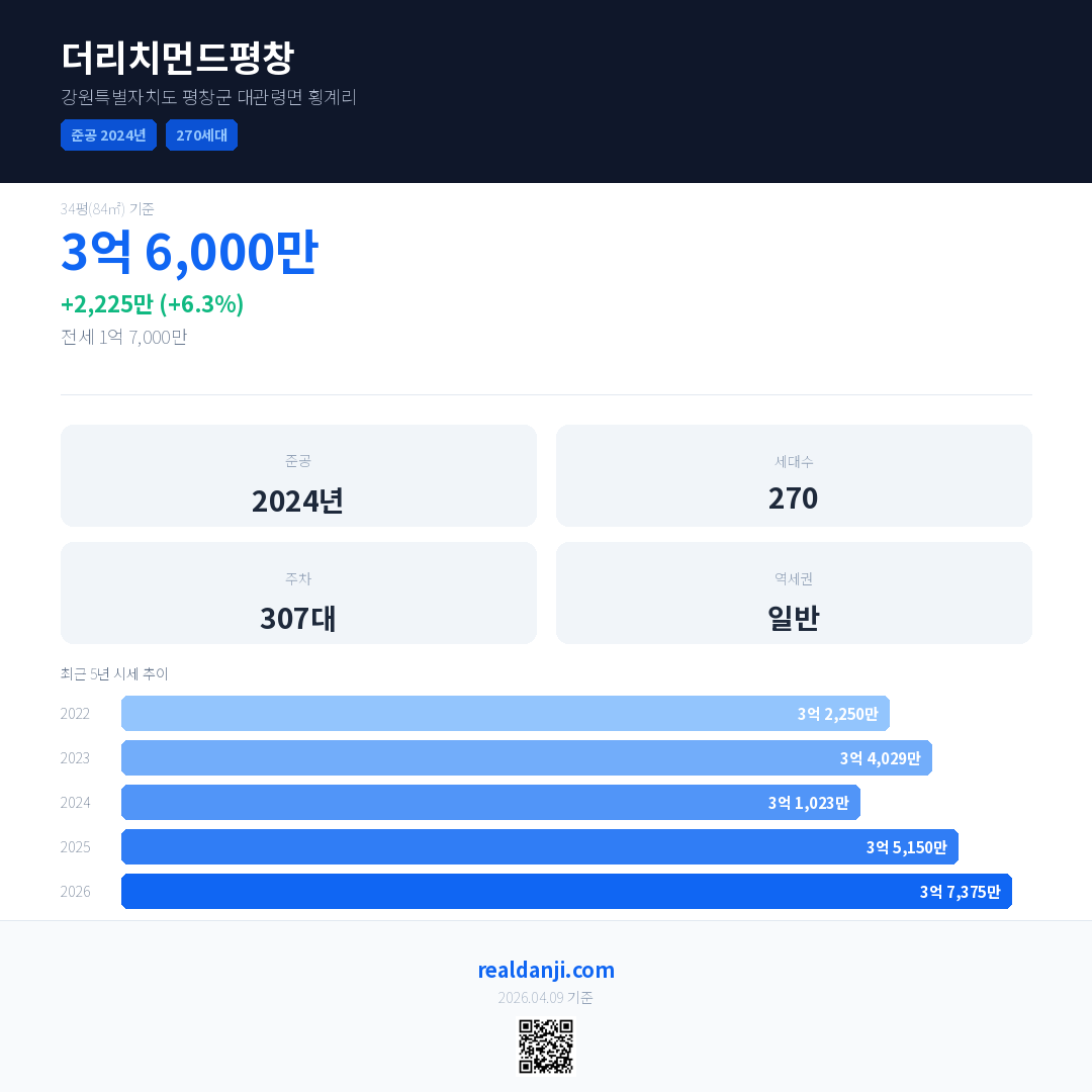더리치먼드평창 국민평형 기준 2026년 평균 거래가는 3억 7,375만으로, 전년 대비 6.3% 상승 했습니다.