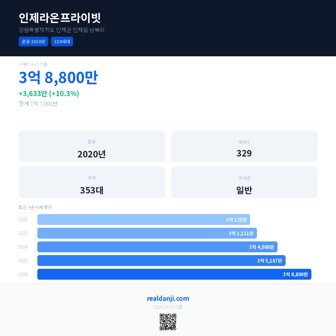 인제라온프라이빗 국민평형 기준 2026년 평균 거래가는 3억 8,800만으로, 전년 대비 10.3% 상승 했습니다.