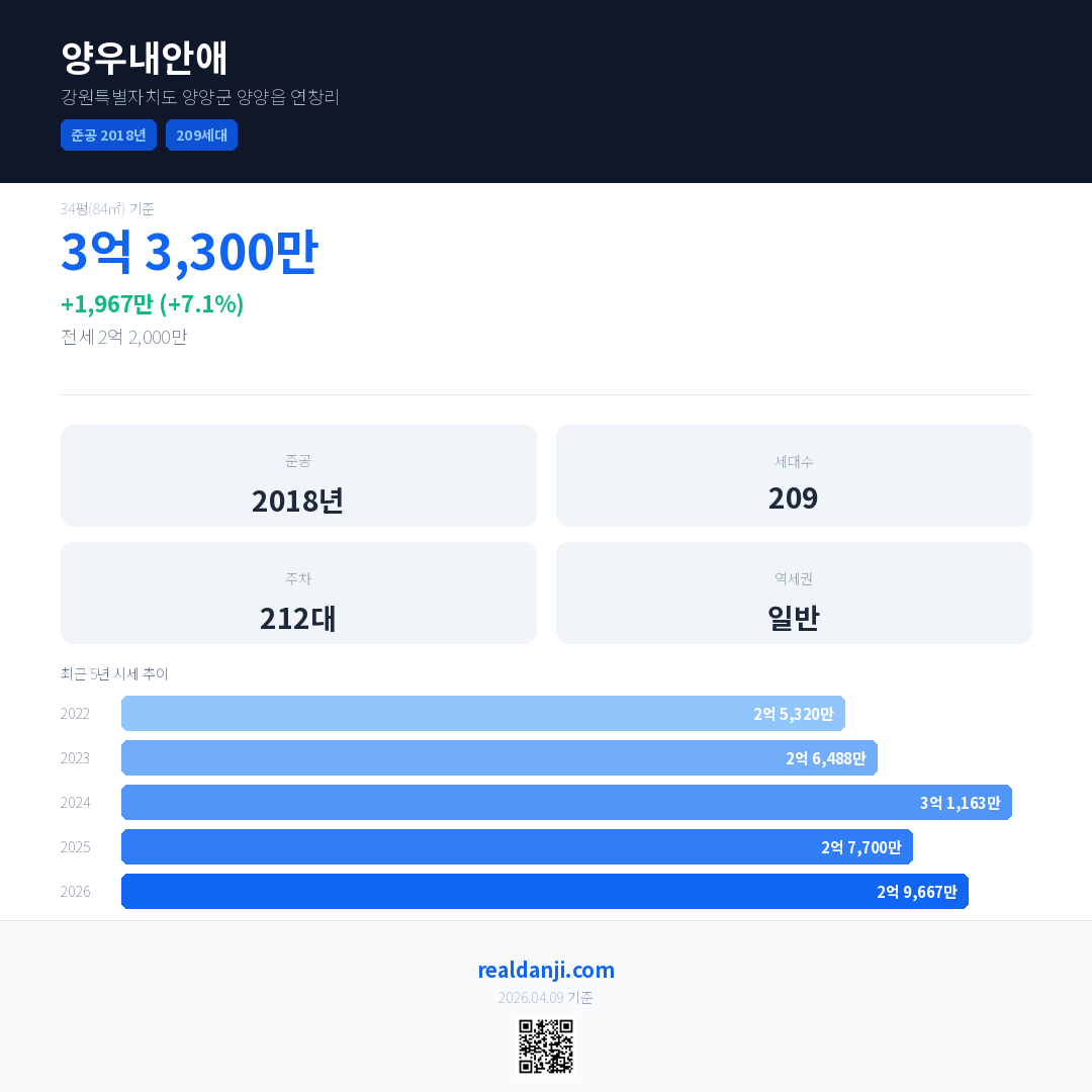 양우내안애은(는) 2018년에 준공되었으며, 현재 8년차입니다. 총 209세대 규모입니다.