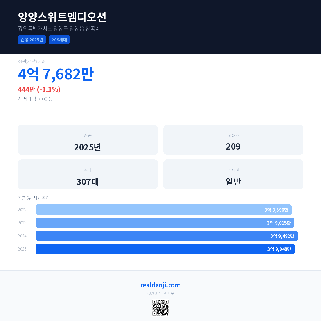 양양스위트엠디오션 최근 거래가는 4억 7,682만입니다. (2025-11)