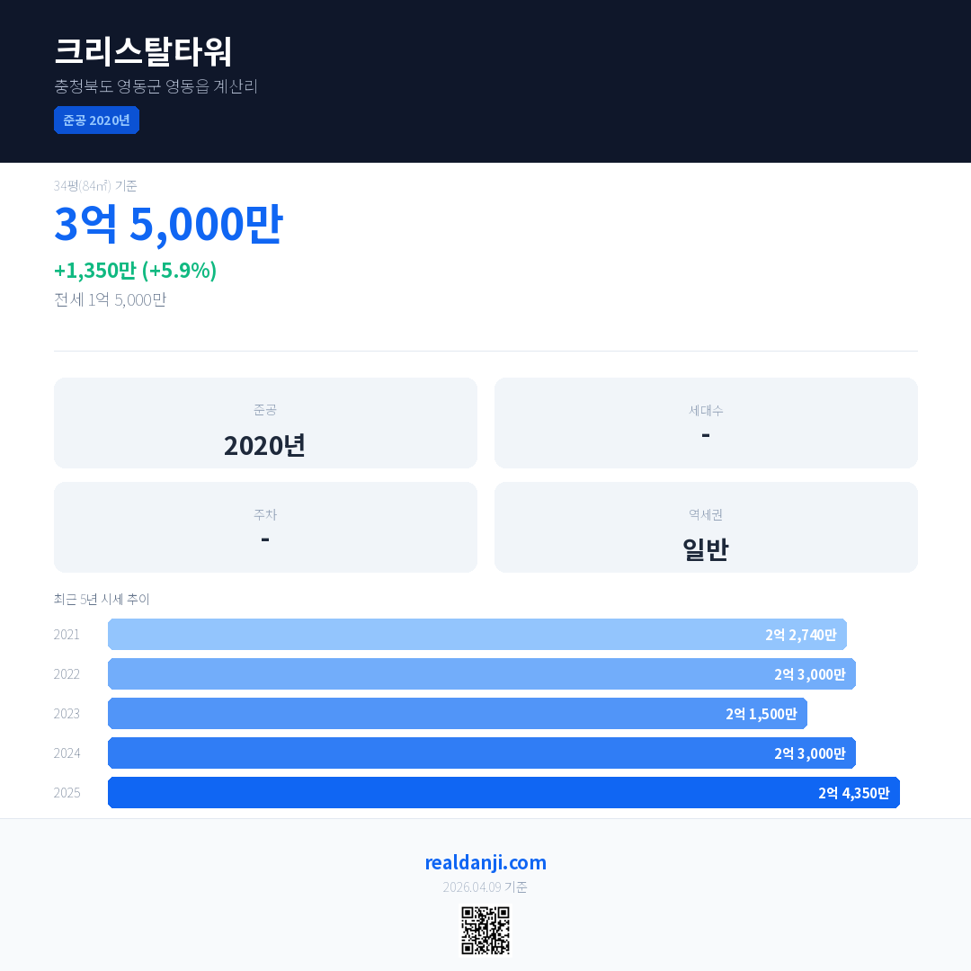 크리스탈타워 국민평형 기준 2025년 평균 거래가는 2억 4,350만으로, 전년 대비 5.9% 상승 했습니다.