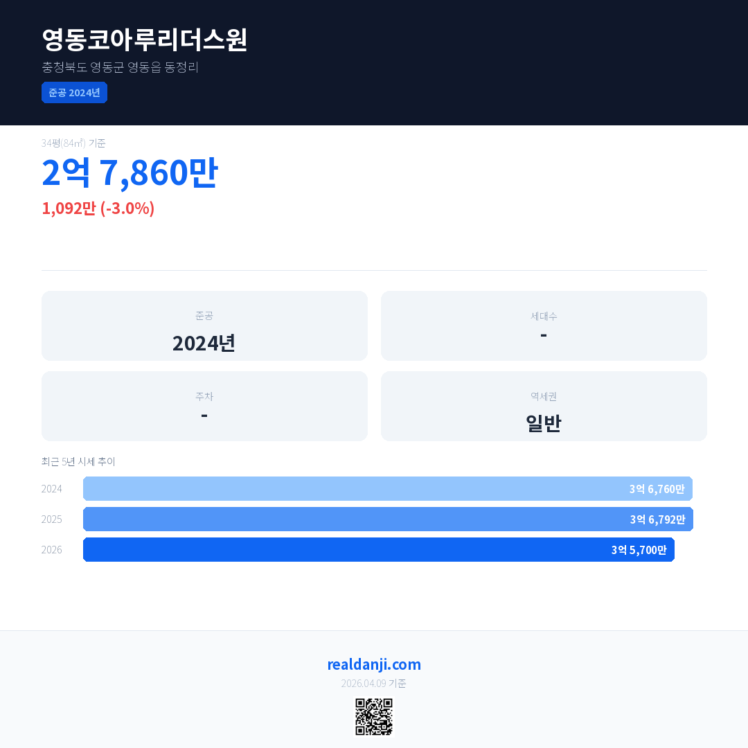 영동코아루리더스원 최근 거래가는 3억 7,087만입니다. (2026-04)