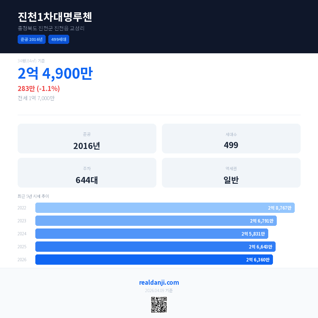 진천1차대명루첸 국민평형 기준 2026년 평균 거래가는 2억 6,360만으로, 전년 대비 1.1% 하락 했습니다.
