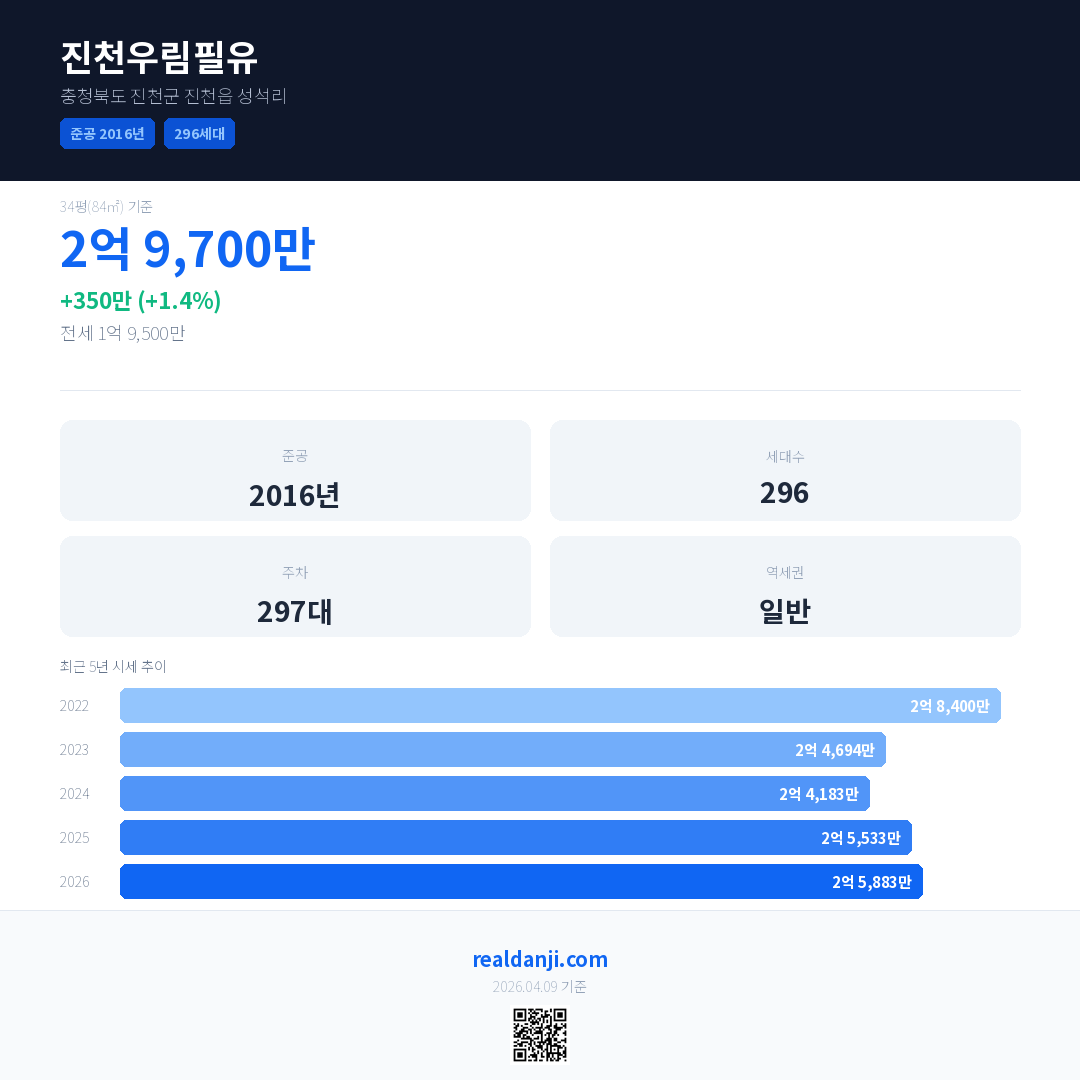 진천우림필유 최근 거래가는 2억 9,700만입니다. (2026-03)